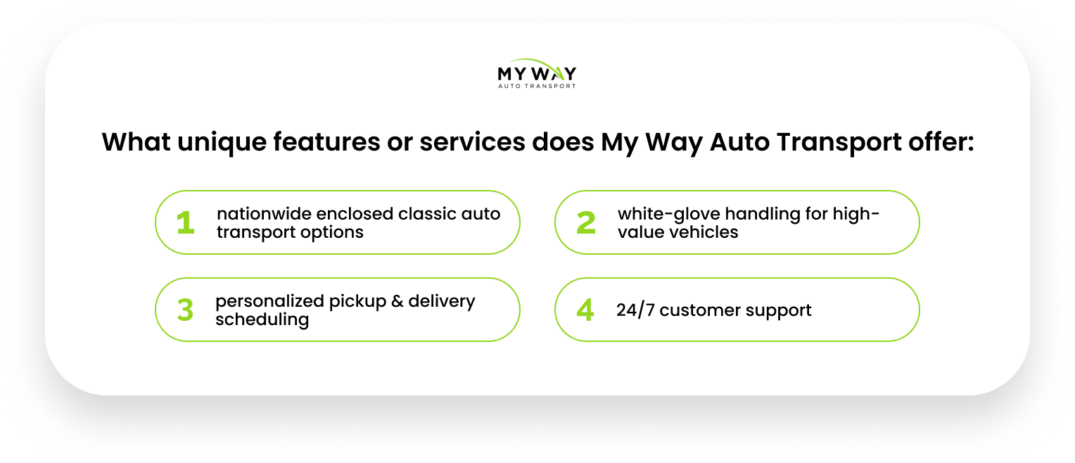 My Way Auto Transport provides reliable, nationwide enclosed classic auto delivery with specialized white-glove handling for high-value vehicles. They offer personalized pickup and delivery schedules, ensuring your car is transported safely and conveniently. Transparent communication, expert logistics for every luxury car auto delivery job, and 24/7 customer support give customers peace of mind throughout the process. You can call (844) 416-2544 to speak with specialists or request custom enclosed auto shipping quotes to start planning your transport.